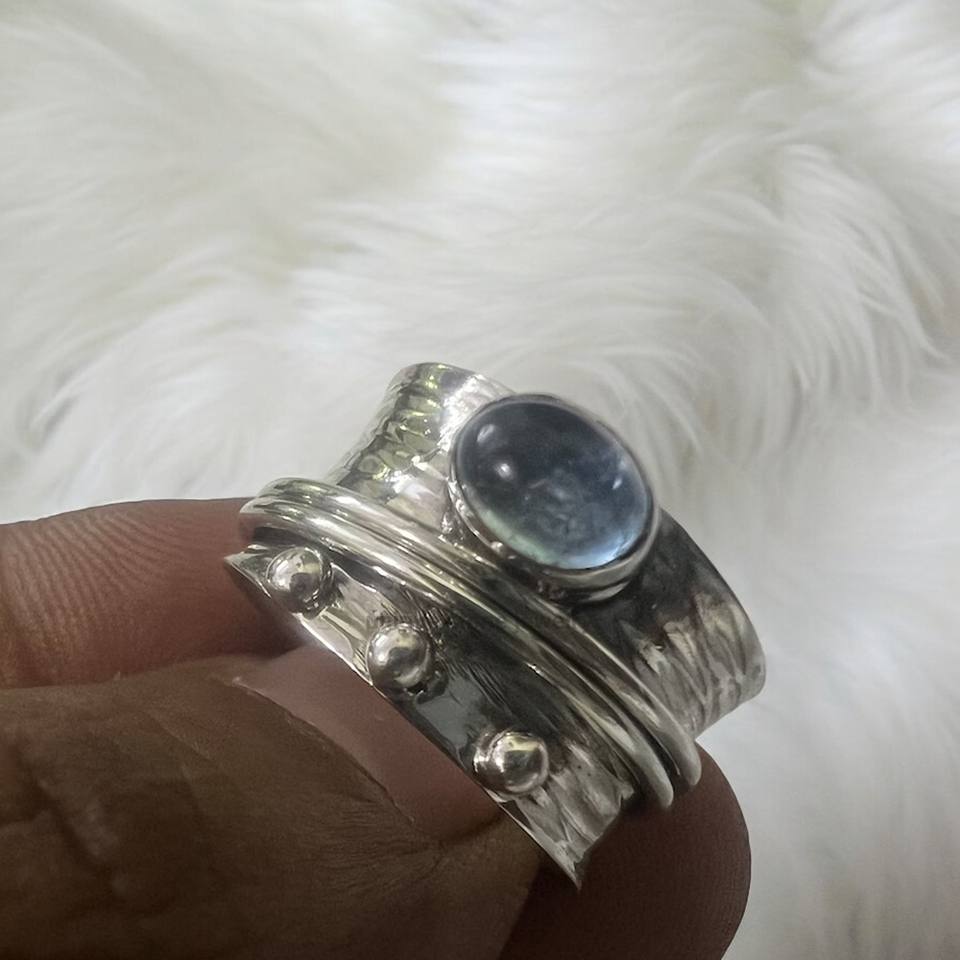 Designer Handmade 925 Sterling Silver Spinner Ring Aquamarine Diamond Pearl Fine Jewelry Natural Gemstone Oval Cut Bezel Setting