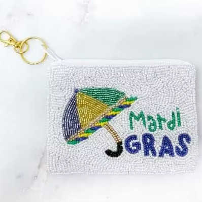 Designer Handmade Fully Beaded Mardi Gras Festivals Small Coin Purses for Women Girls Anti-Theft Zipper Polyester White Storage