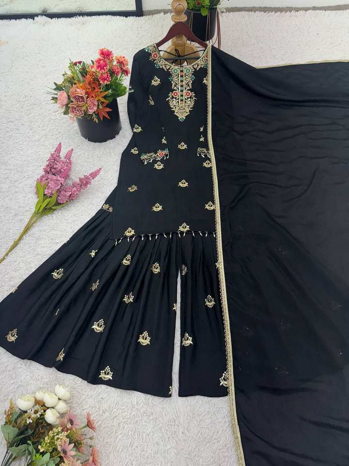 Designer Heavy Embroidery Sequence Work Top-Sharara Dupatta Indian & Pakistani Party Wear with Lace Sleeves Made Chinon Silk