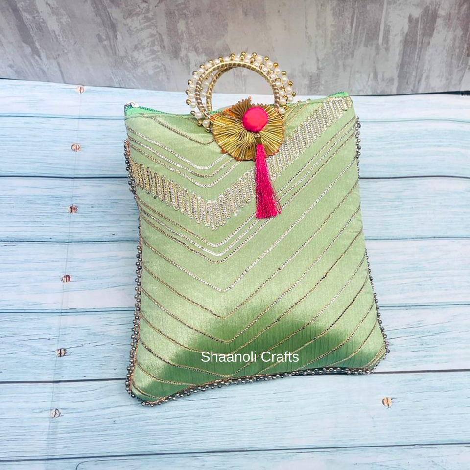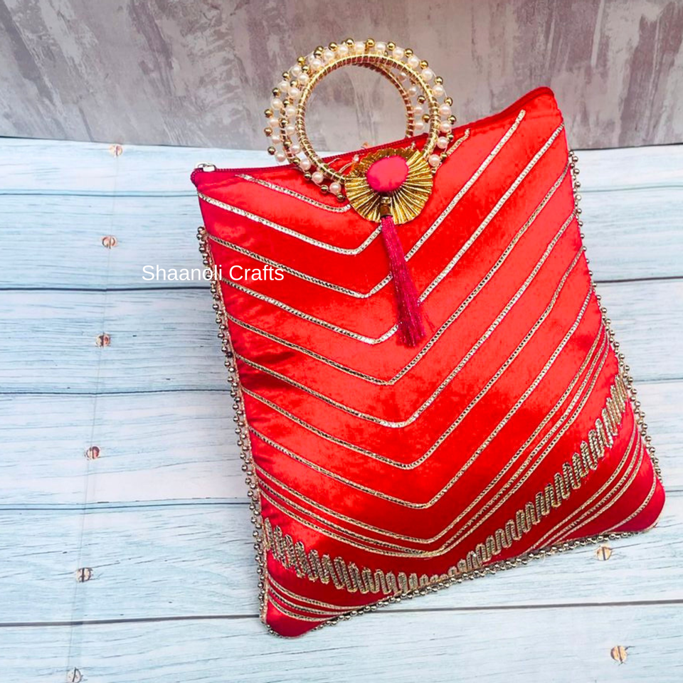 Designer Luxury Raw Silk Gota Patti Lace Work Wrist Handle Rectangle Handbags Beautiful Zari Work Hand Bags for Wedding Decor
