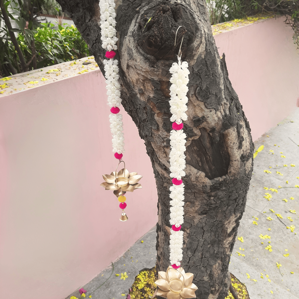 Designer Magra Pompom Garland With Brass Lotus Hanging Red Pom Pom Work Design Garlands for Wedding, Haldi, Mehendi, Decor