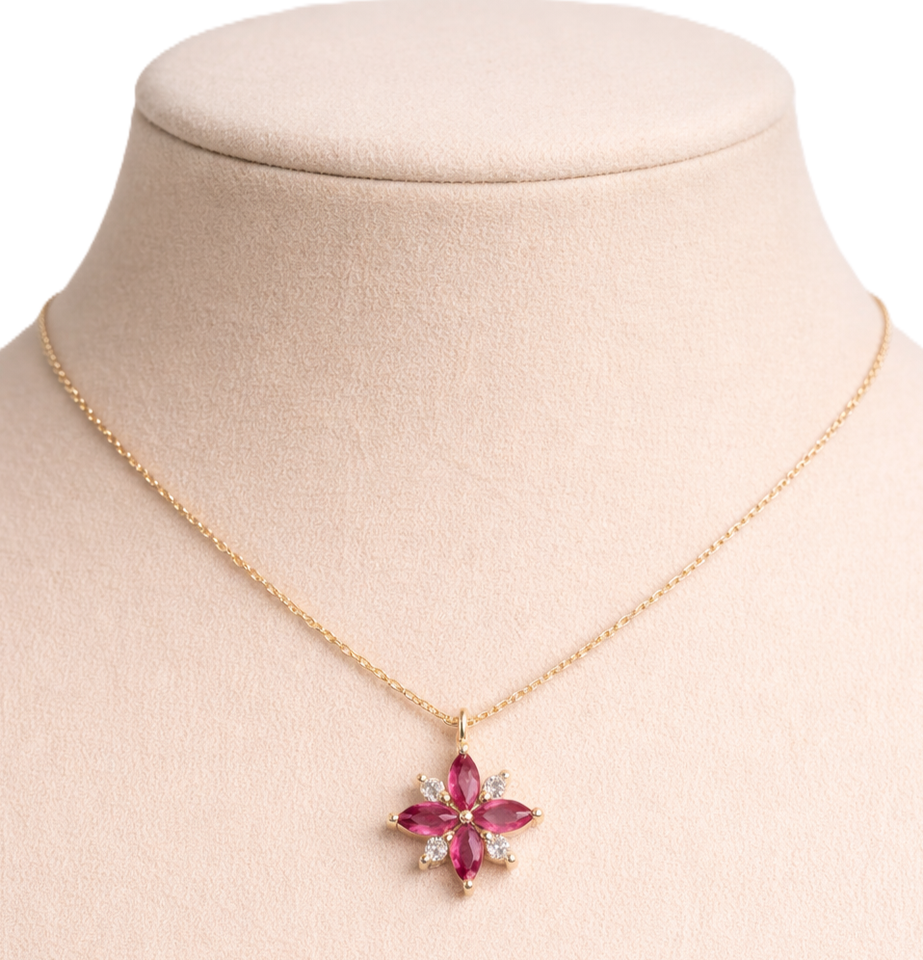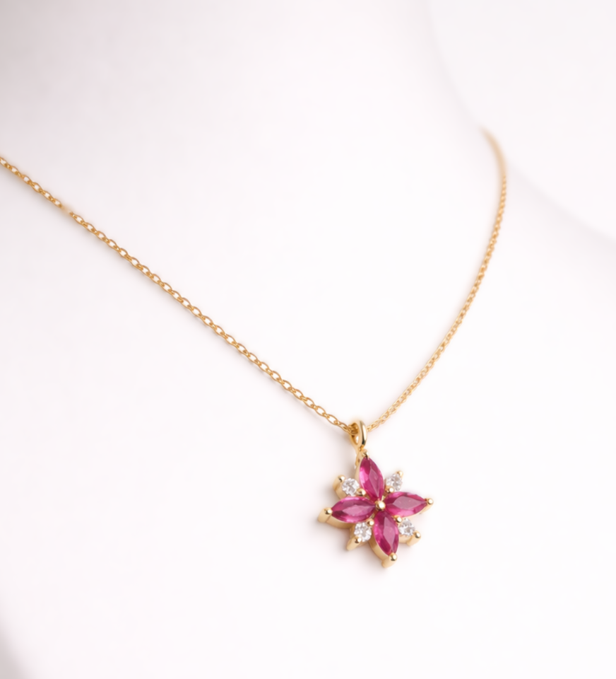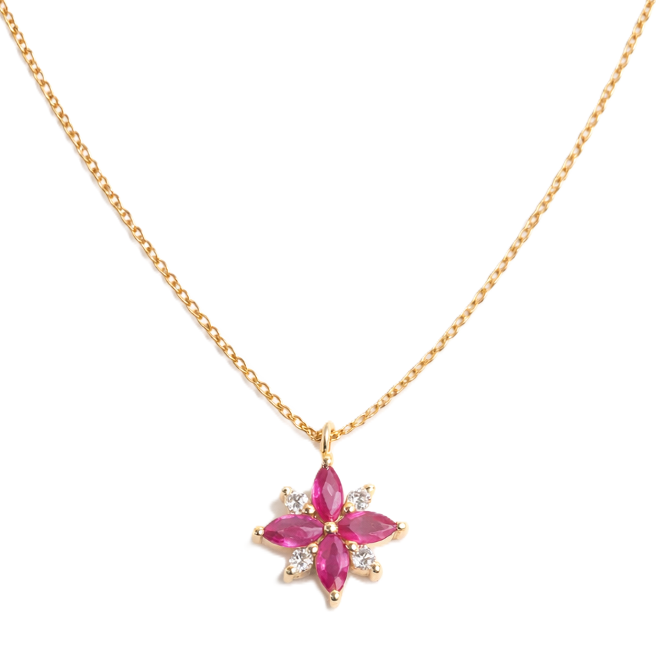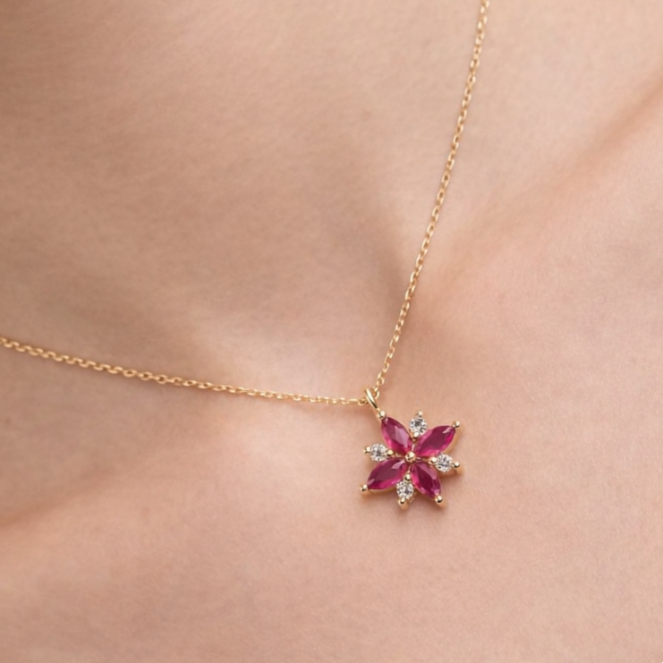 Designer Marquise Ruby & Diamond Flower Pendant Necklace 18K Solid Yellow Gold Dainty Pendant Fine Floral Bridal Wedding Jewelry