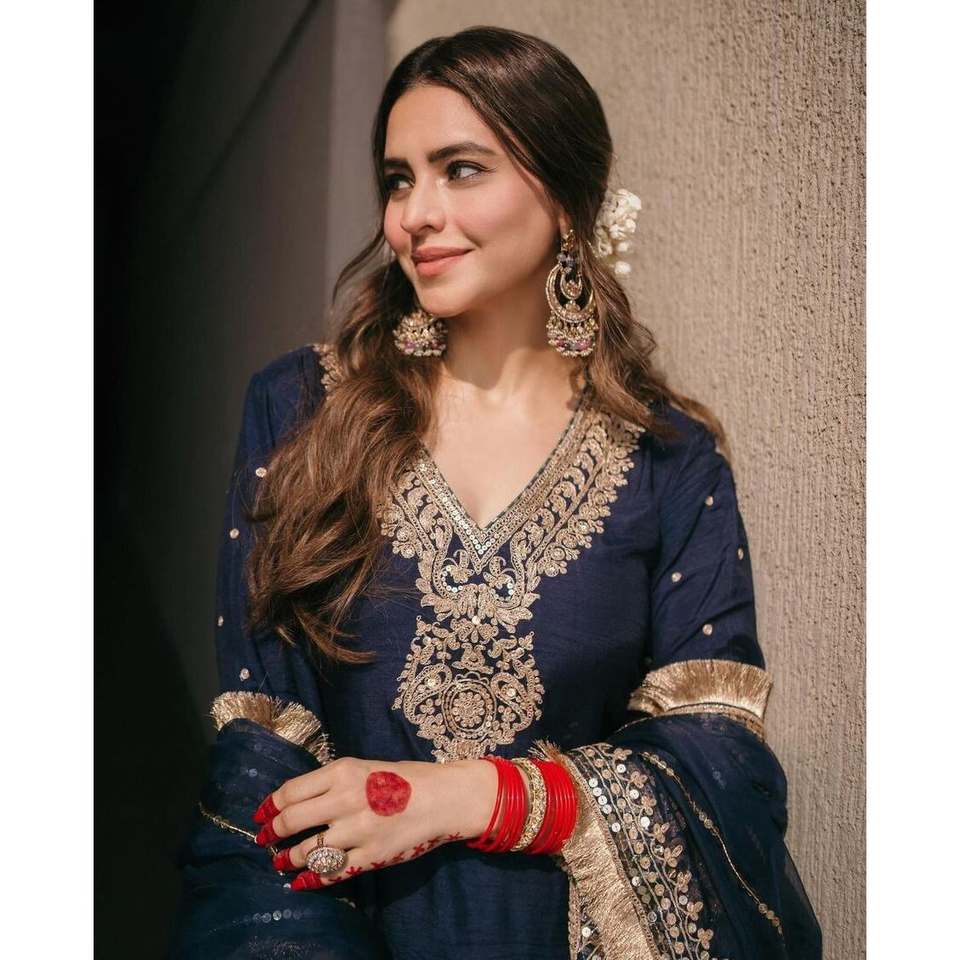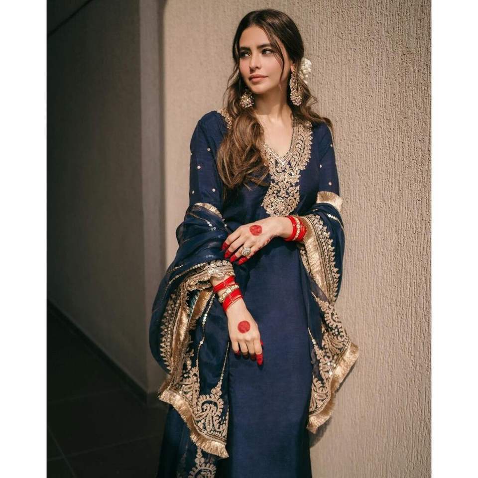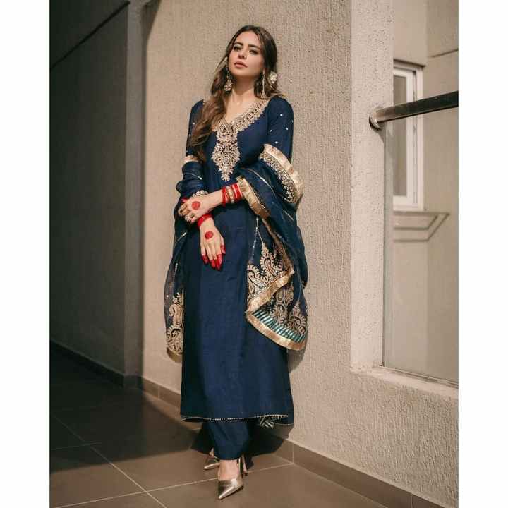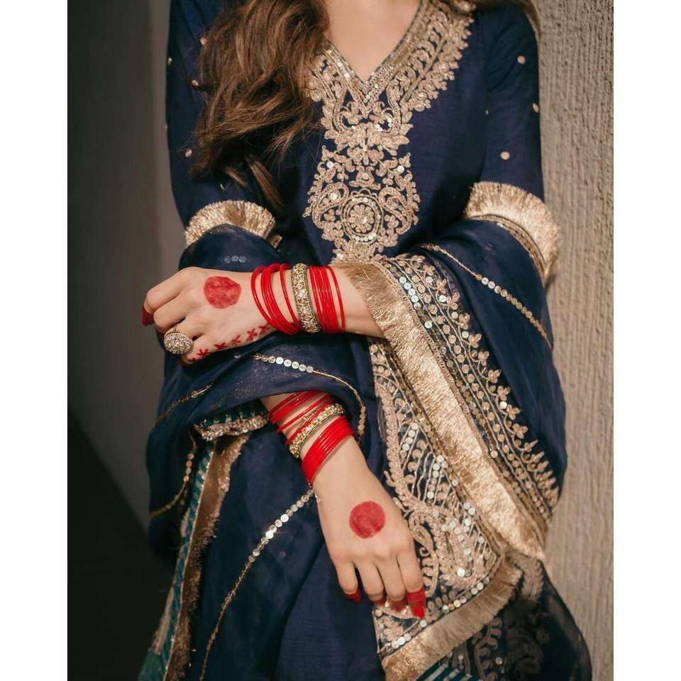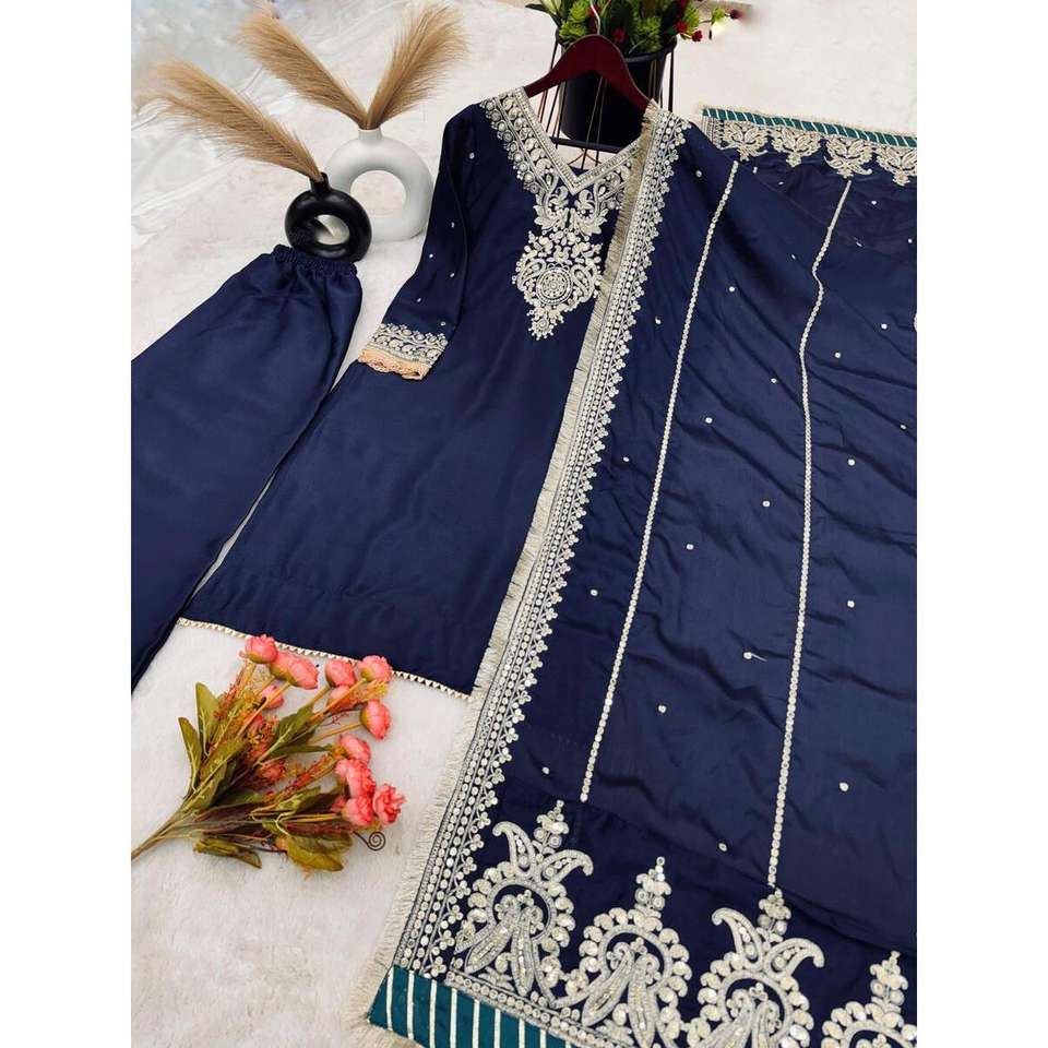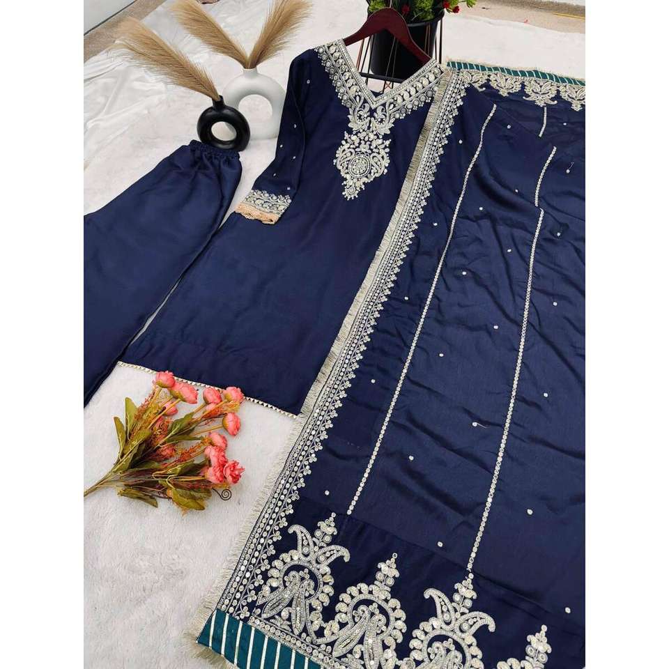 Designer Modest Navy Blue CHINON EMBROIDERY SEQUENCE WORK TOP BOTTOM with DUPATTA Sequined