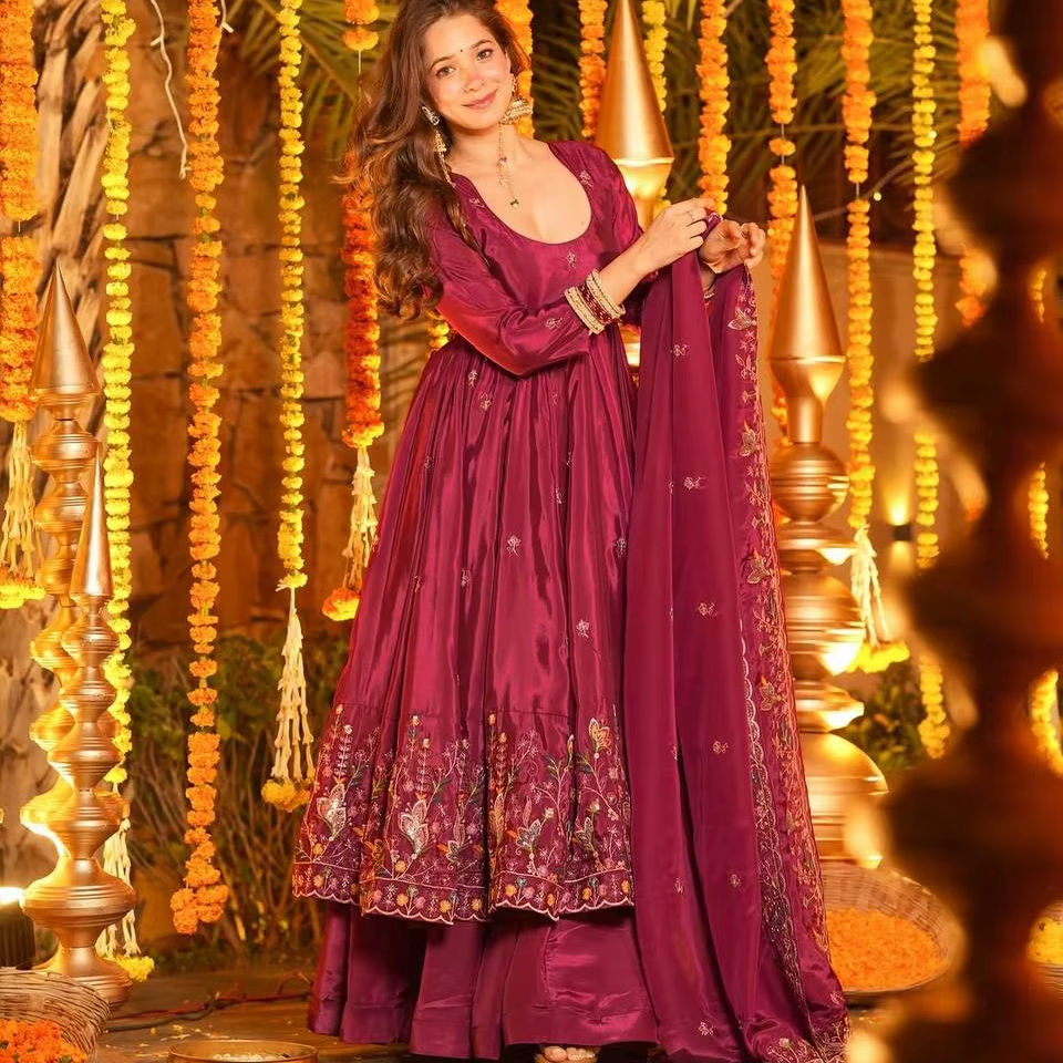 Designer Polyester Bollywood Anarkali Palazzo Set Thread Sequin Work Flared Silhouette Matching Dupatta Salwar Kameez