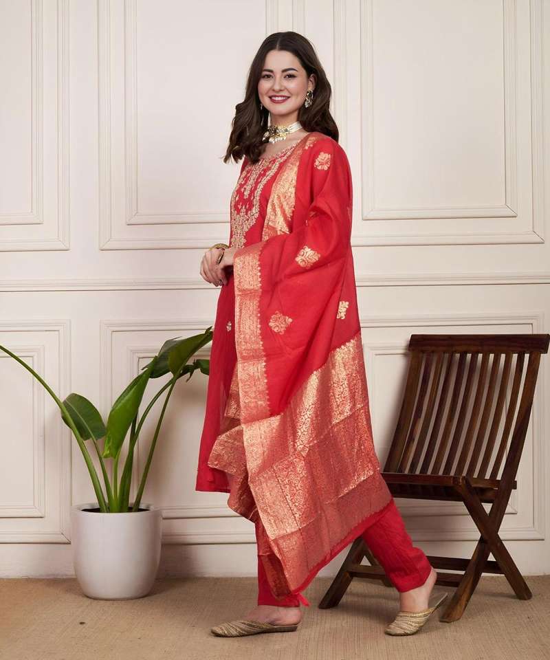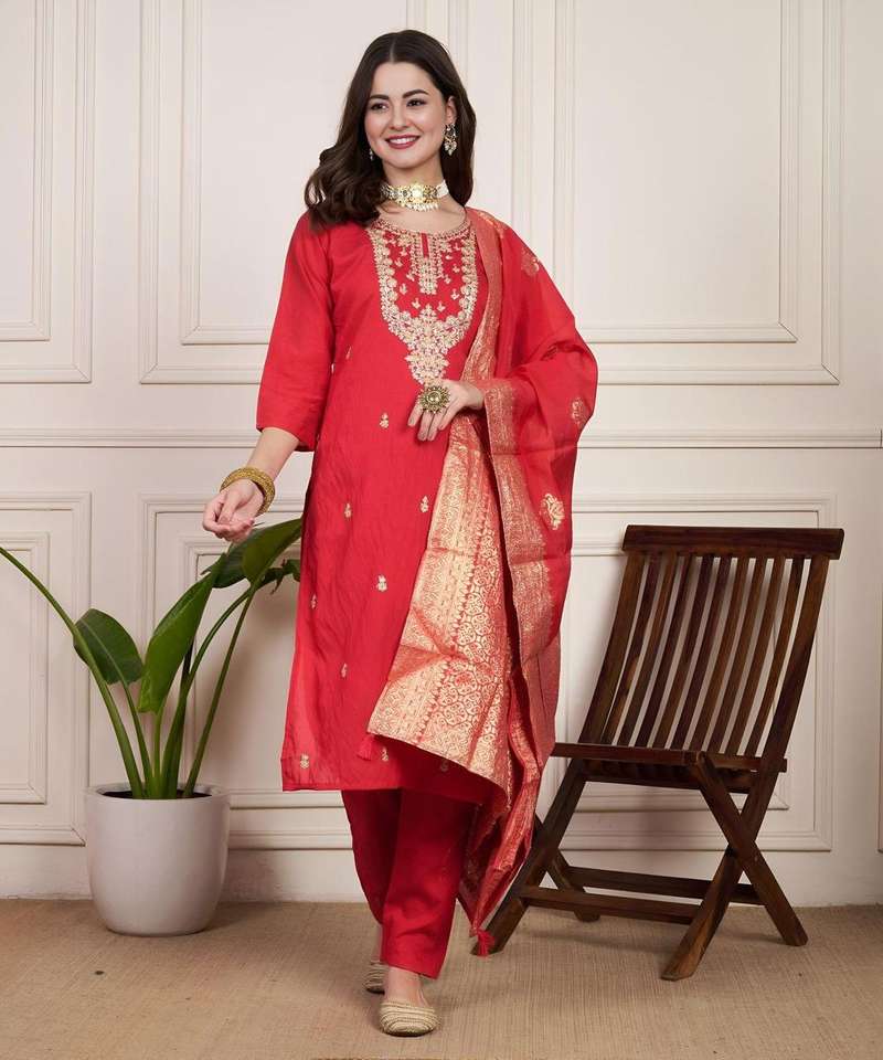 Designer Pure Diamond Silk Cotton Hand Embroidered Top With Long Sleeve & Heavy Work Neck Hand Embroidery & Pant With Dupatta