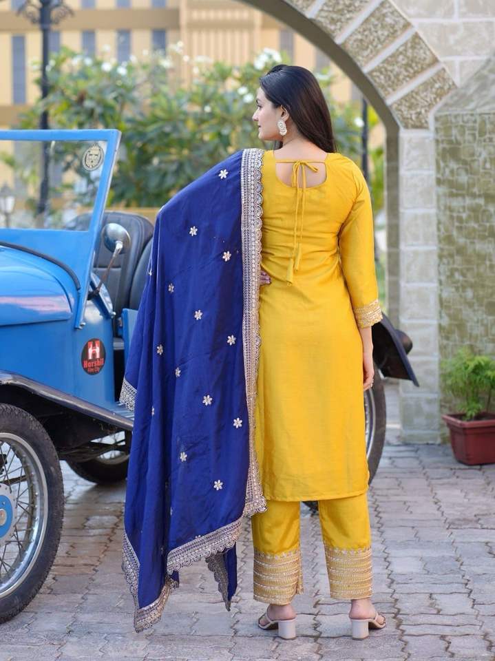 Product Name:Designer Roman Silk With Sequins Embroidery Kurti Pant And Dupatta