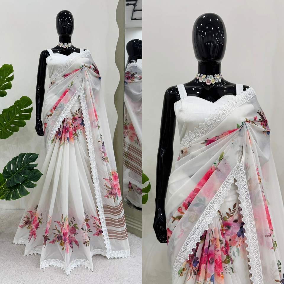 Designer Silk Sari in Faux Georgette with Digital Print & Fancy Lace Blouse Beautiful Traditional Style for Summer Parties