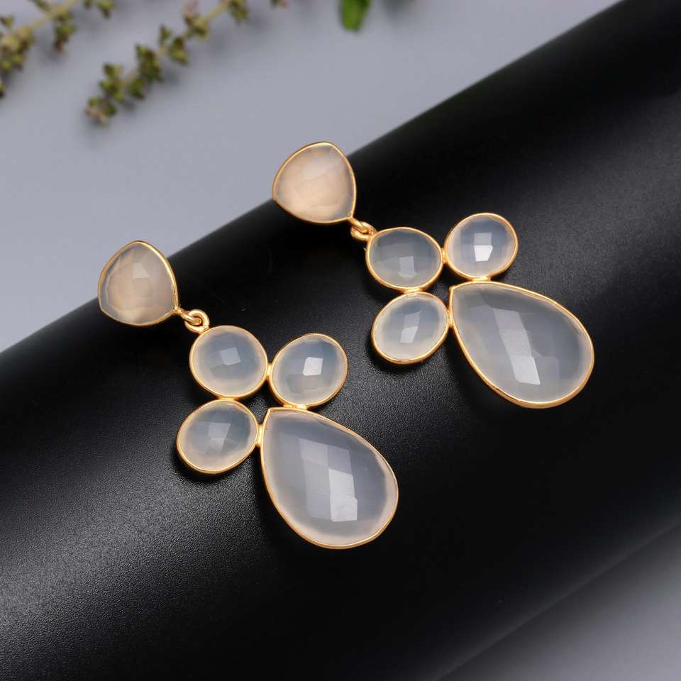 Designer Solid Natural High Quality White Chalcedony Gemstone Gold Plated 925 Sterling Silver Drop Earrings Jewelry for Women