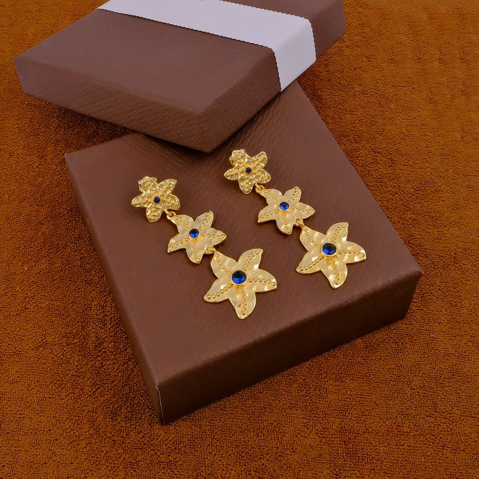 Designer Statement Earrings for Women Handcrafted Iolite Quartz Triple Starfish Drop Gold Plated Dangle Brass Jewelry Trendy
