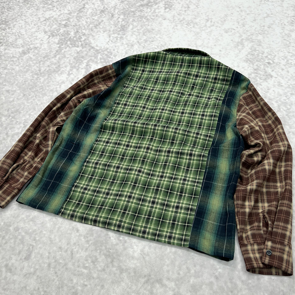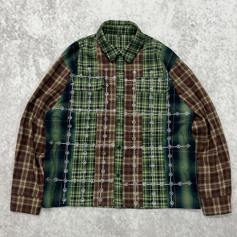 Designer Streetwear Flannel Check Acid Wash Oversized T Shirts With Logo Custom Men Rhinestone Plaid Button Up Long Sleeve Shirt