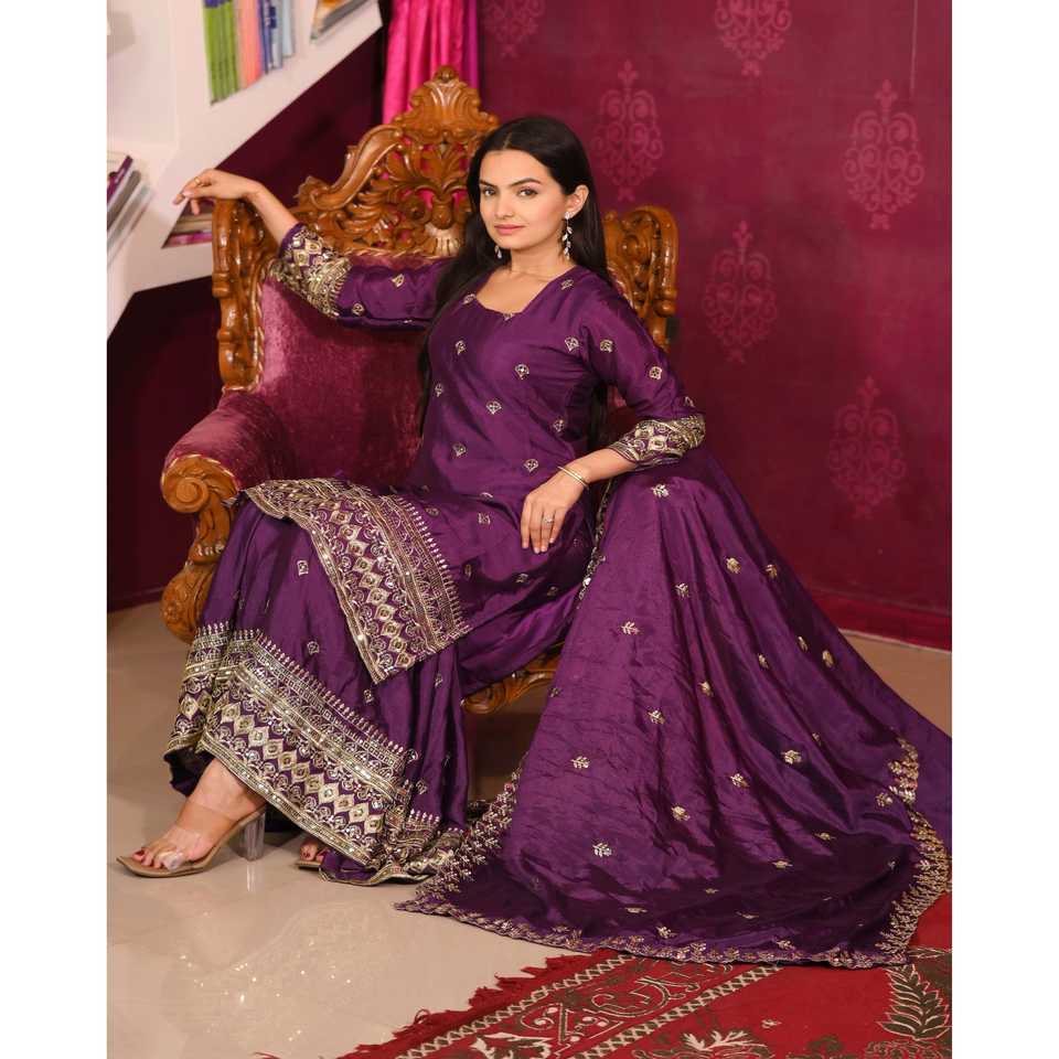 Designer Traditional Chinese Clothing Embroidered Chinon Suit with Sequence Embroidered Work