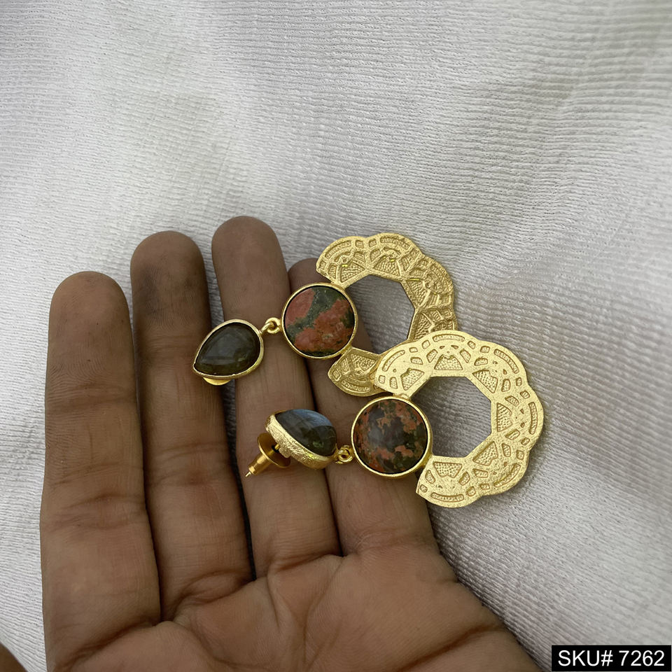 Designer Vintage Gold-Plated Brass Earrings with Geometric Stud Labradorite Gemstone Trendy Drop Style for Engagement or Gift