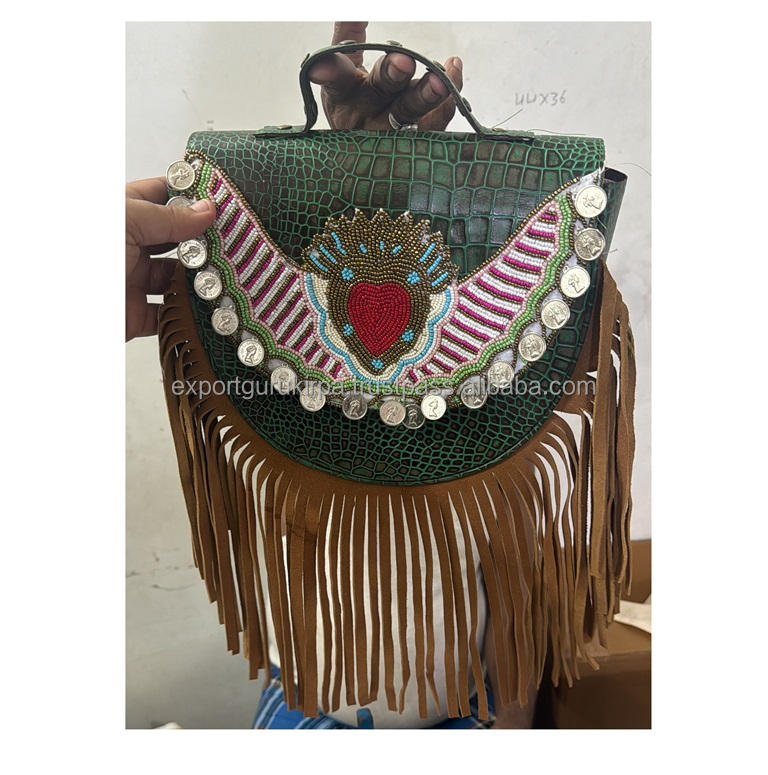 Designer Women's Boho Beaded Cowhide Leather Messenger Bags Handmade Shoulder Bag for Evening Shopping Indian Bohemian Style