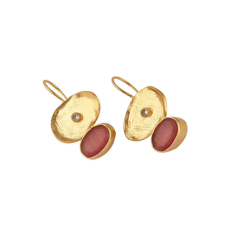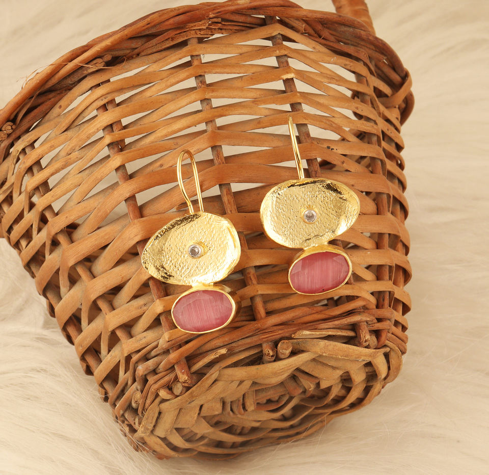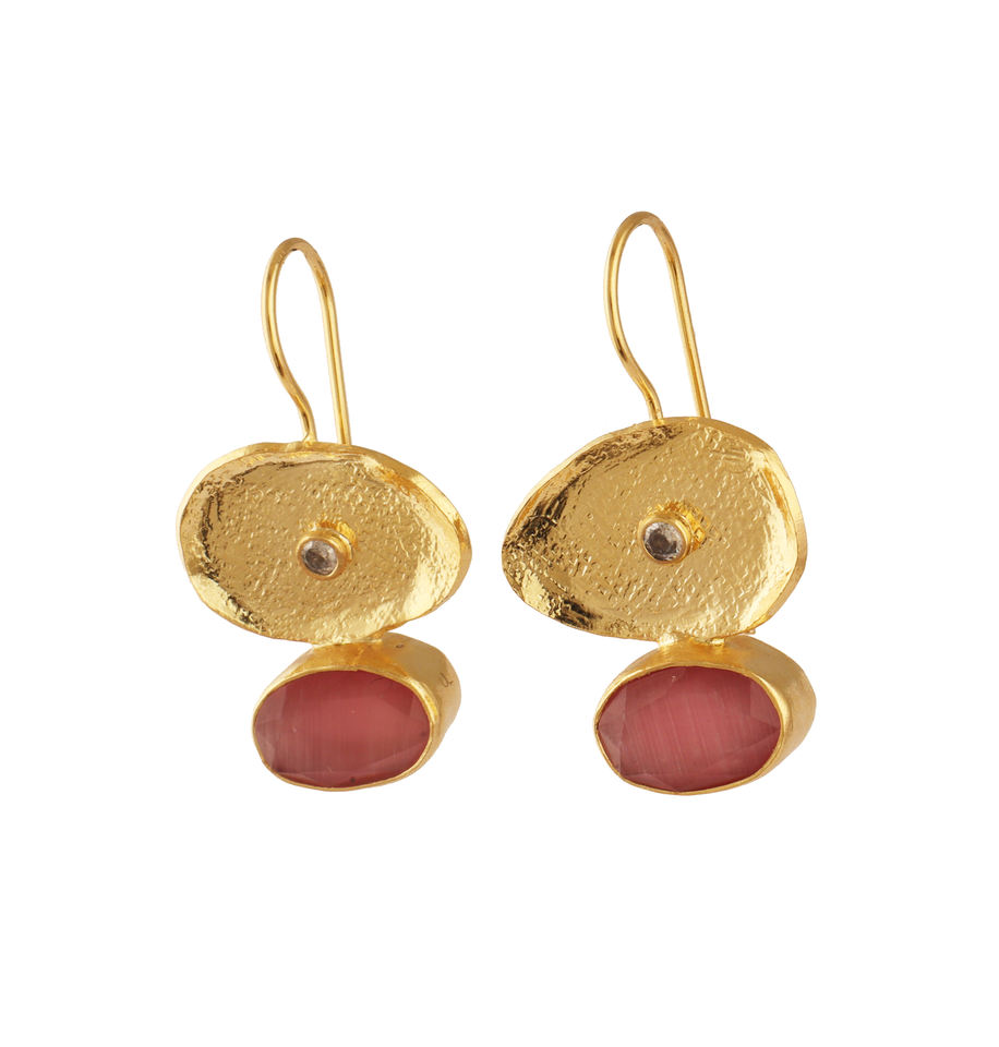 Designer earring oval cut pink cat's eye texture metal charm earring with tiny cz 18k gold plated fashion dangle hook earring