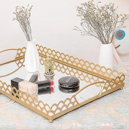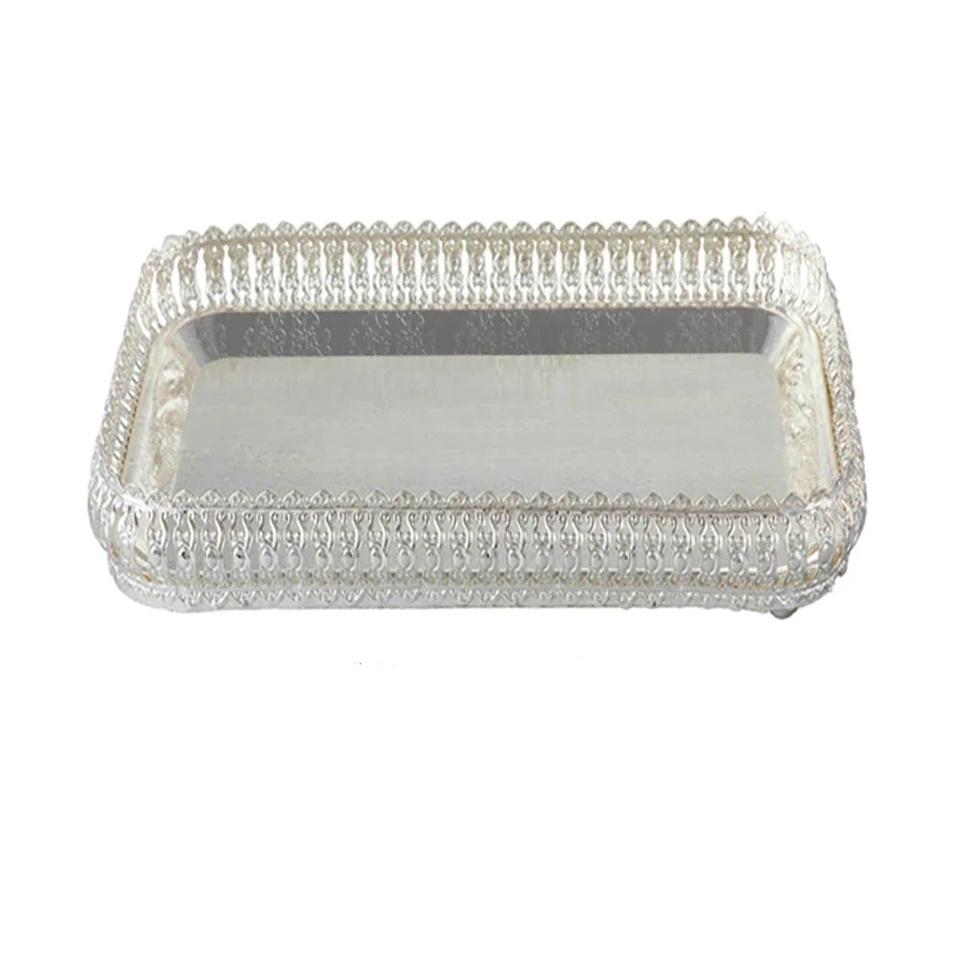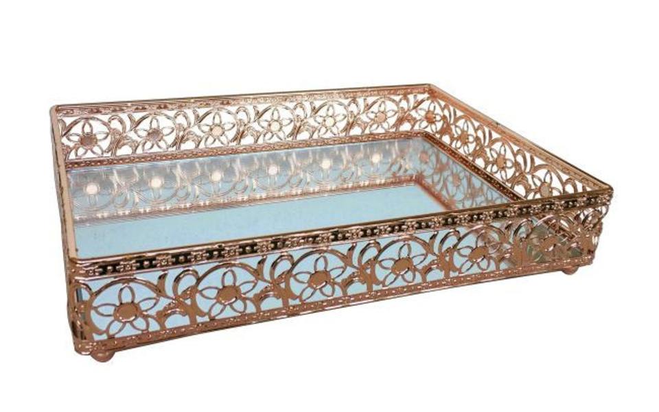 Designer metal tray with a refined finished for use in modern kitchen decor living spaces or as a table centerpiece
