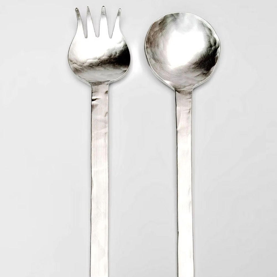 Designer stainless steel salad server with slim handles and stylish fork design suitable for fruit salad or greens