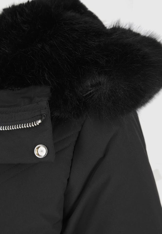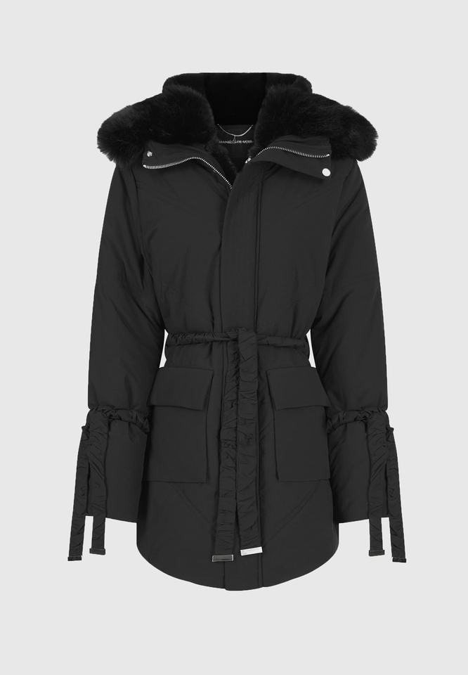 Detachable Textured Belt & Ties Miter Pockets Faux Fur Longline Padded Black 100% Polyester Woven Zipper Closure Coat for Women