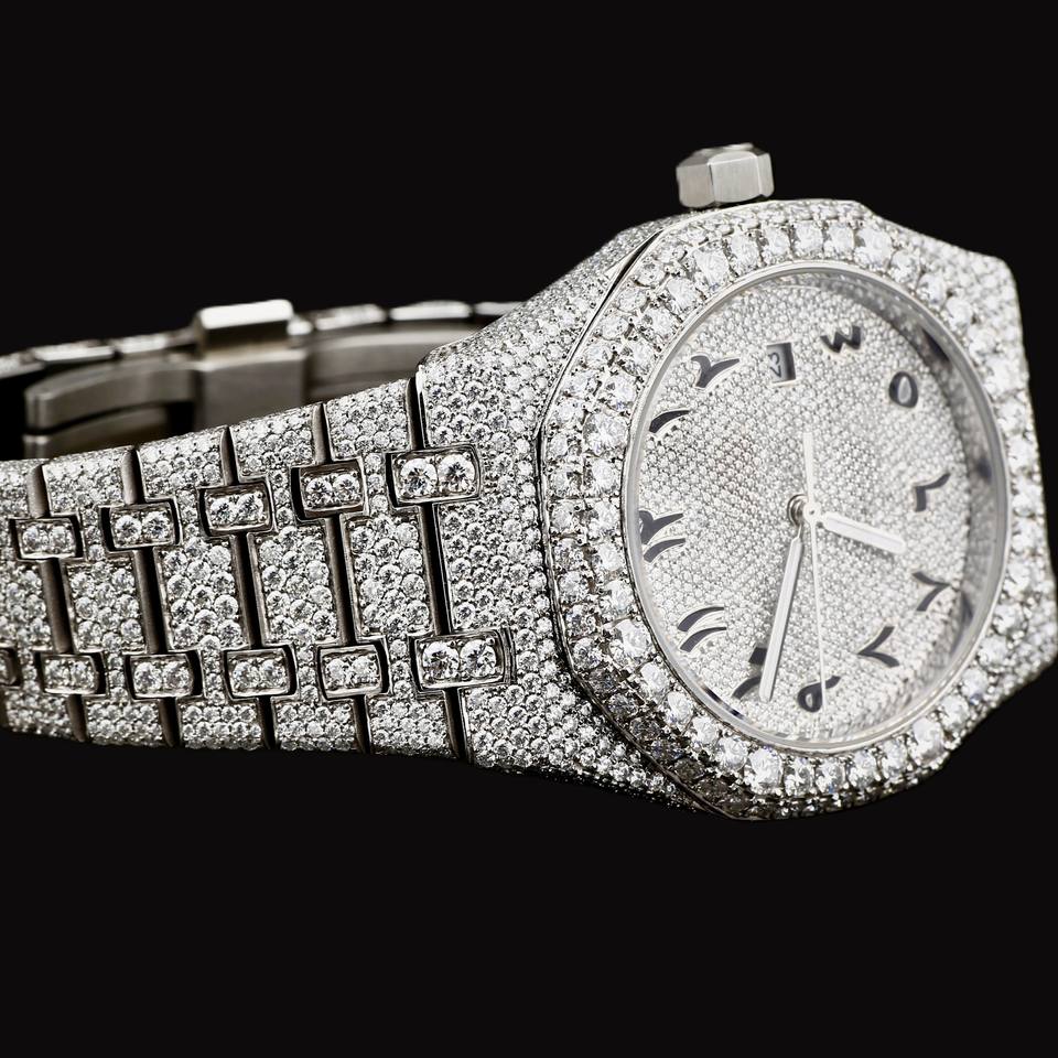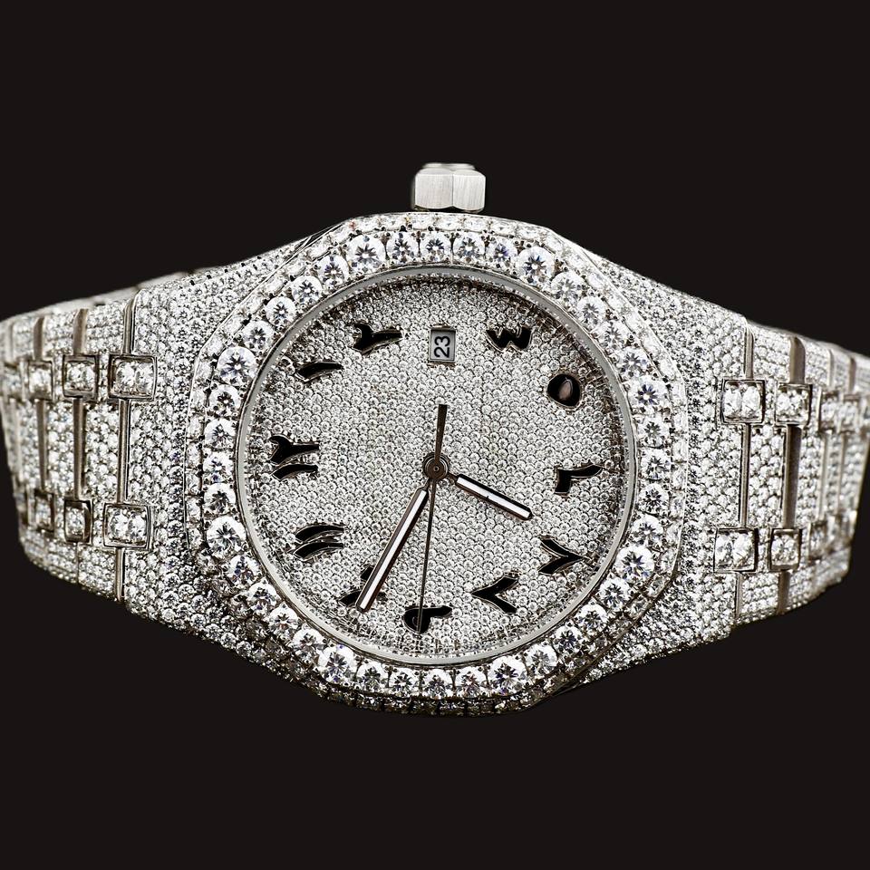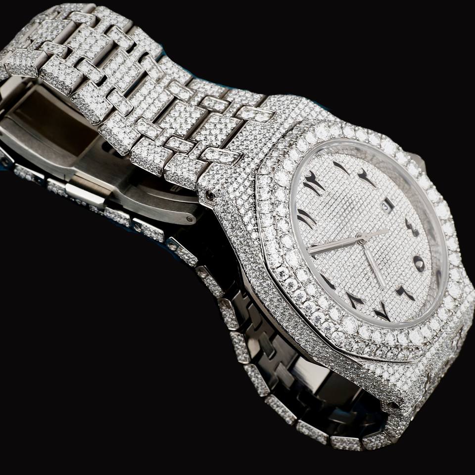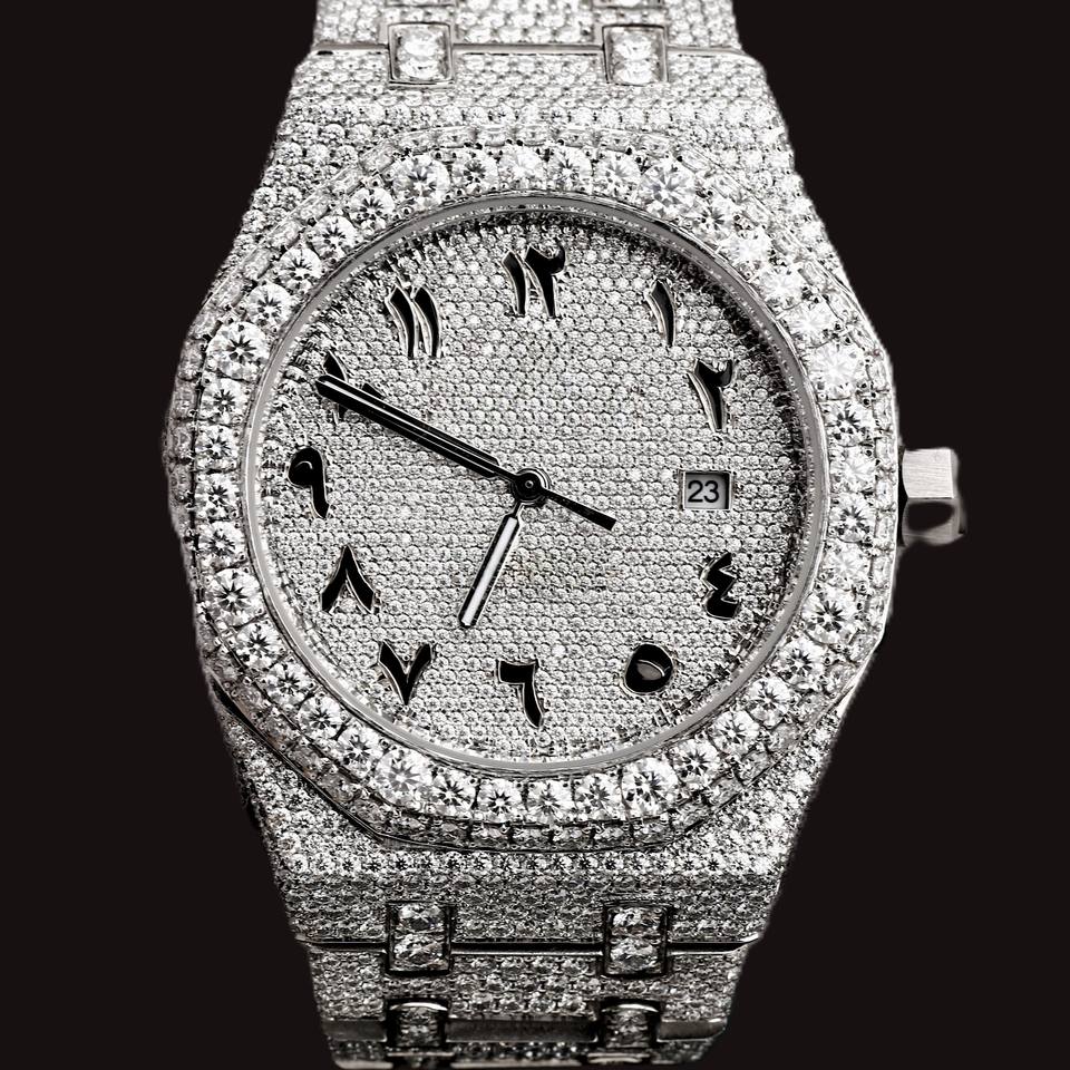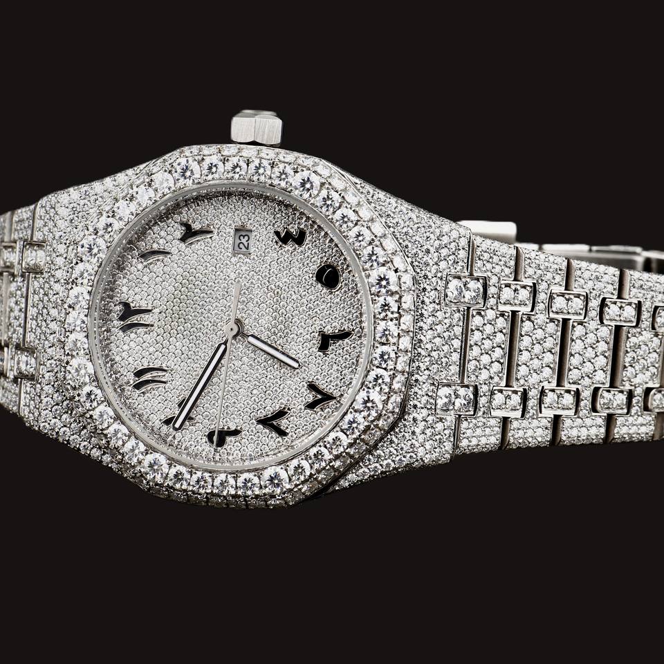DiaDream Gems & Jewel Fashion Hip Hop Man's 41mm Round Arabic Numerals Dial Moissanite Diamond Quartz Movement Silver Band Watch