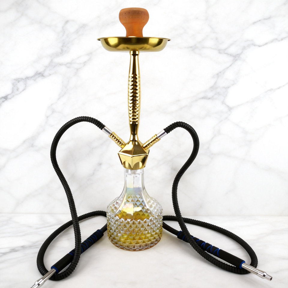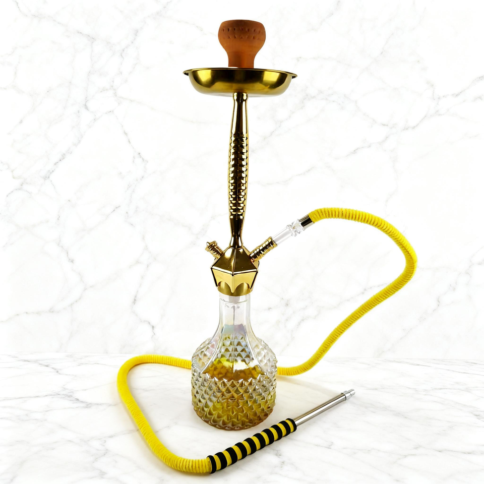 Diamond Pattern Clear Glass Base Yellow Striped Hose Stainless Steel Body Wooden Top Single Hose Shisha Hookahs