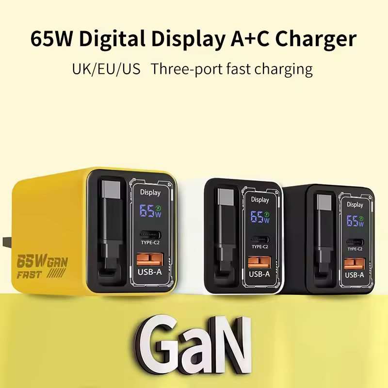 Digital Display 65W GaN Charger Built in Retractable Cable USB Type C Ports For iPhone Tablet Charger