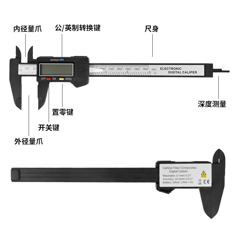 Digital Display Vernier Calipers Plastic Electronic 0-150mm Carbon Fiber Screen for Jewelry Antiques Internal External Diameter