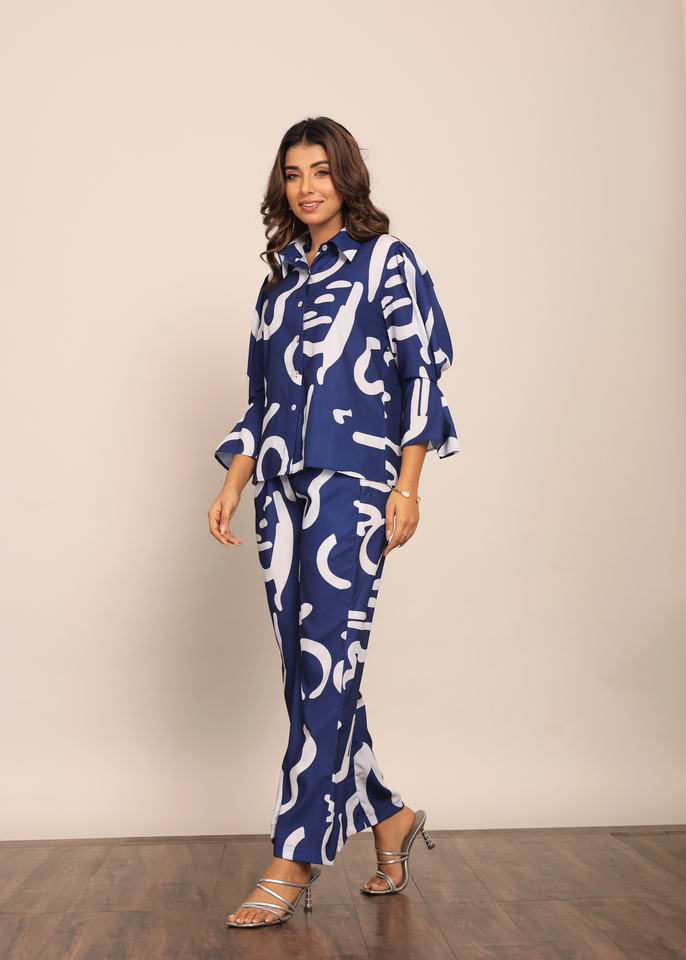 Blue and White Co-Ord Set Relaxed Shirt and Pant with Collar