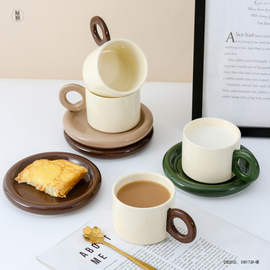 Dingdian Ceramic Coffee Cup And Saucer Set Dark Green Khaki Brown Heat Resisting European Style Solid Color Set