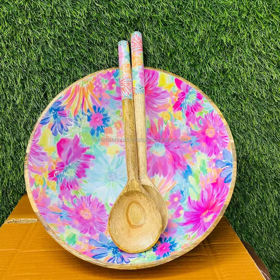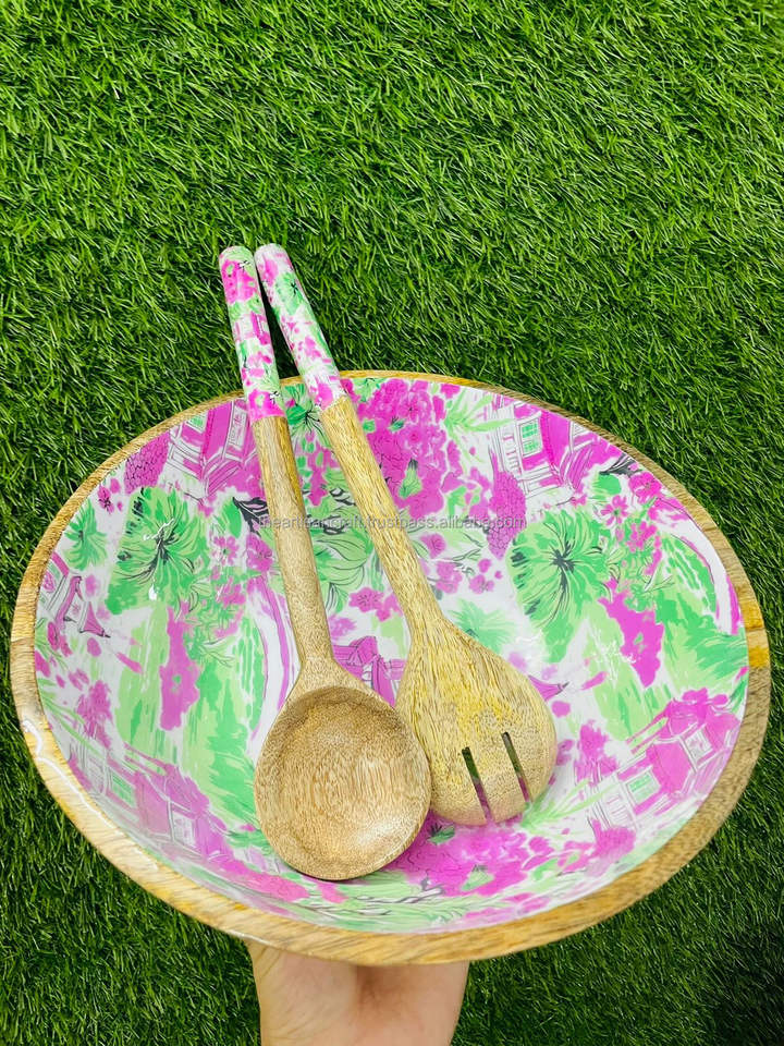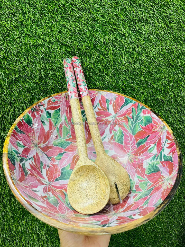 Handcrafted Polished Enamel Printed Mango Wood Serving Bowl Spoon Eco-Friendly Unique Design Durable Decorative for Party Use