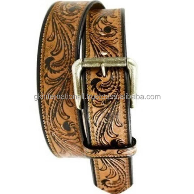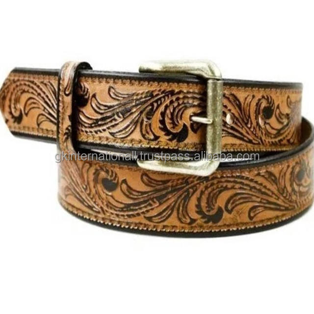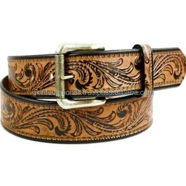 Direct Factory Professional manufacturing Tan Brown Floral Hand Carved Unisex Western Leather Tooling belt brass buckle