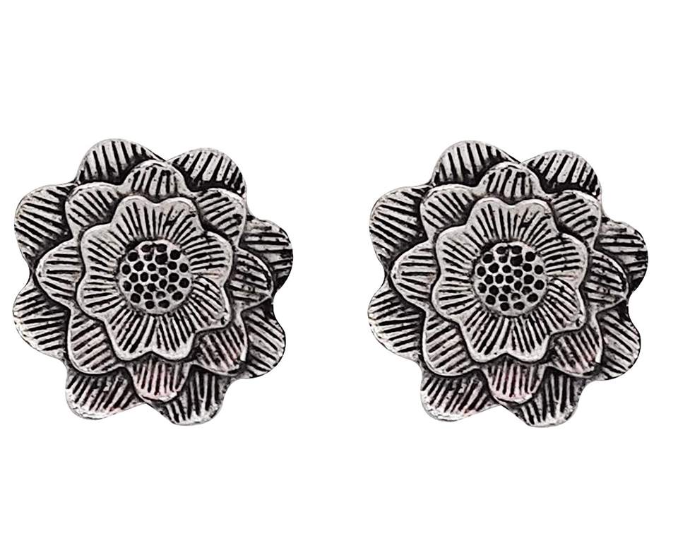 Product Name:Embellished Flower Oxidised Silver Necklace With Stud Earrings
