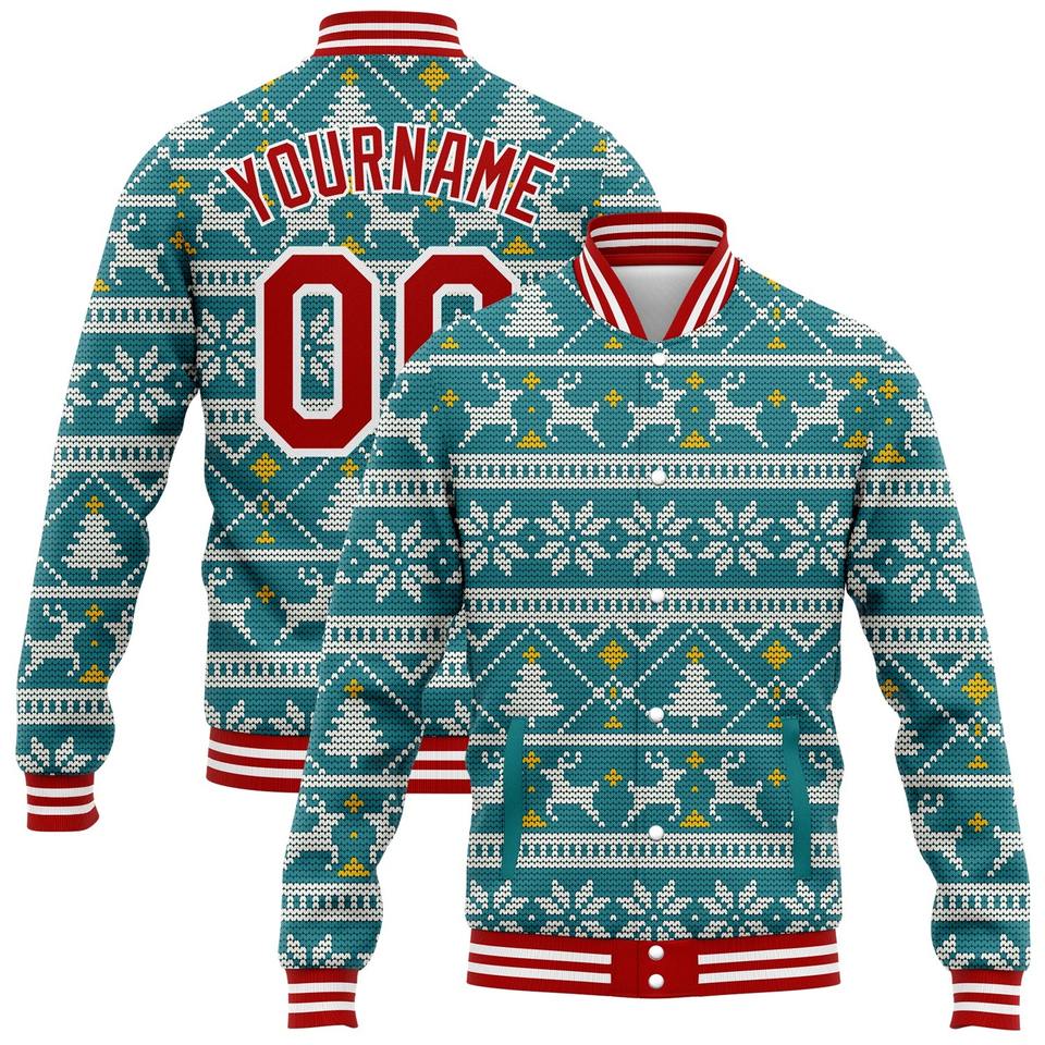 Direct Industry Wholesale Casual Winter Custom Teal Red-White Christmas 3D Bomber Full-Snap Varsity Letterman Jacket