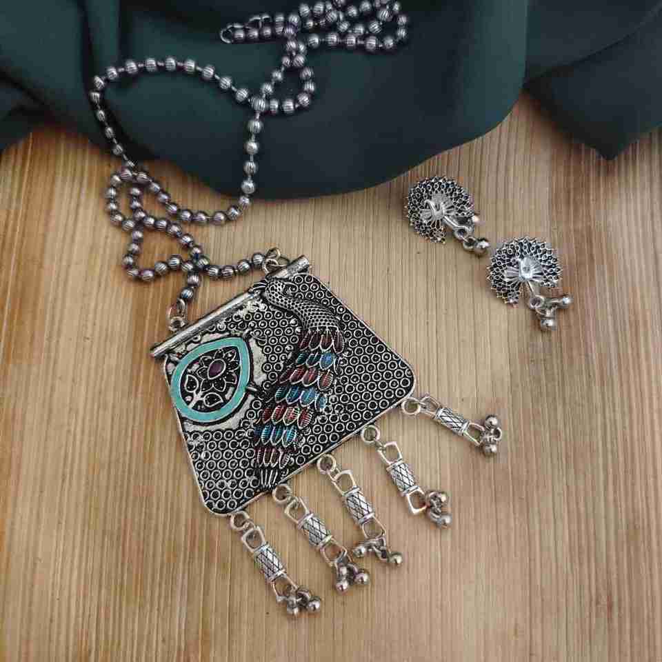 Product Name:Oxidised Peacock Chain Necklace Earrings Set