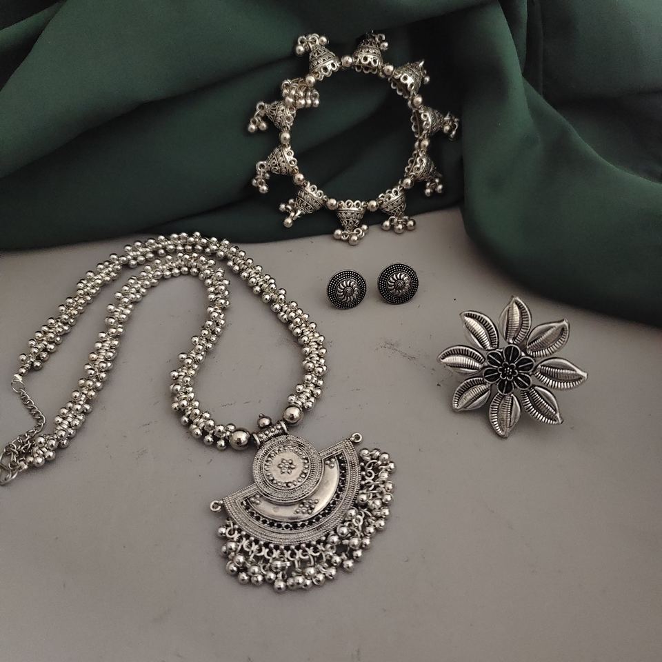 Oxidised Necklace Earrings Ring Bracelet Combo-3