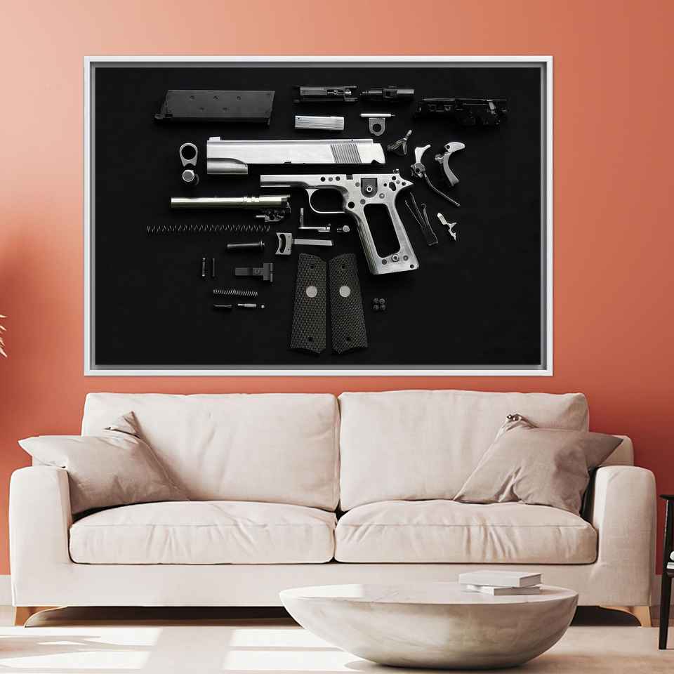 Disassembled Gun Canvas Art Print - Industrial Style Tactical Firearm Decor,1P:White Framed