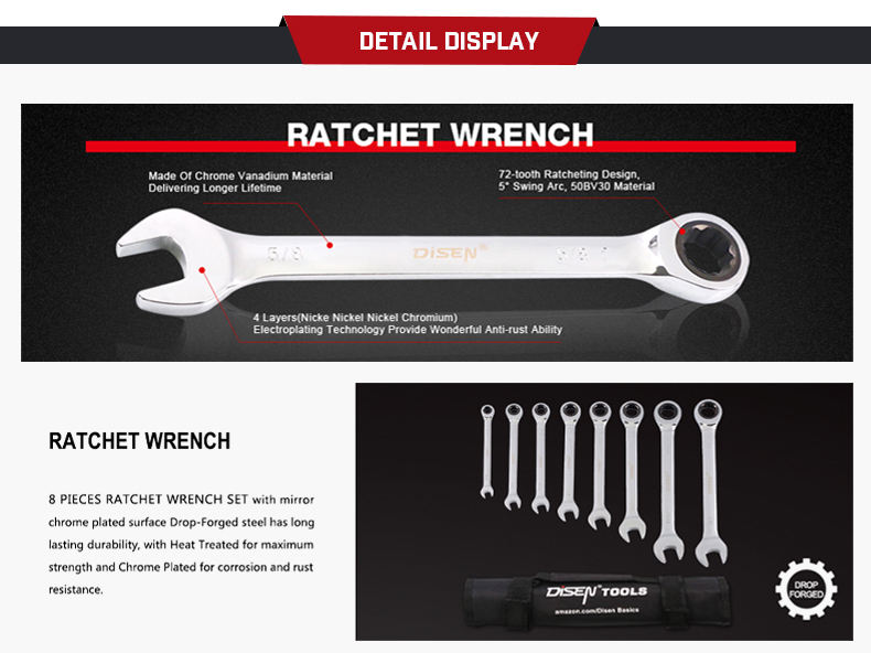 Disen 8-Piece CRV Steel Double End Mirror Chrome Plated Ratchet Wrench Set 250lb-ft Torque High Quality Customizable OEM DIY