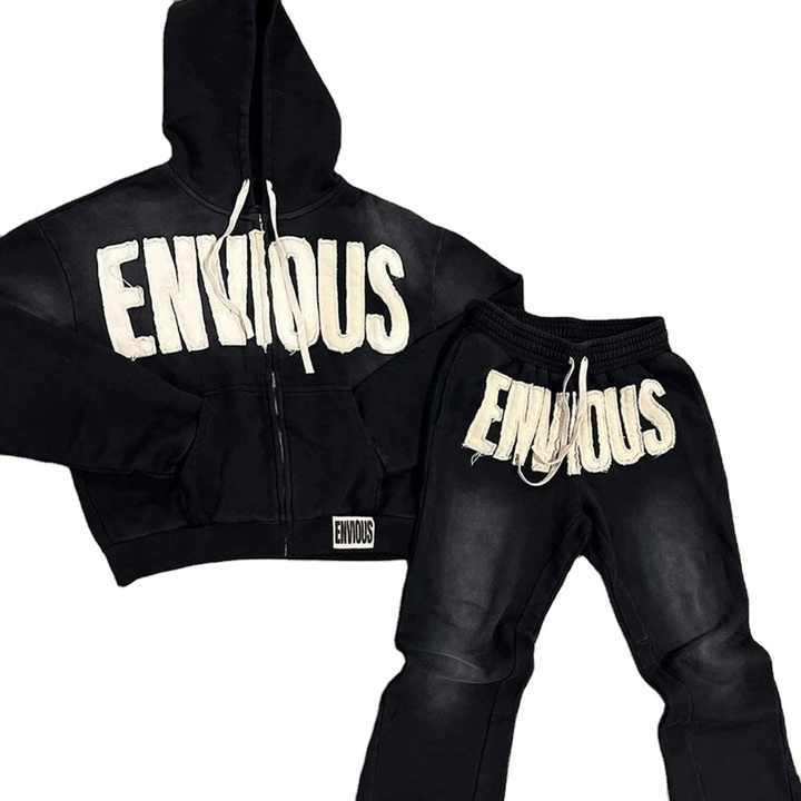Distressed Embroidery Men Acid Wash Hoodie and Sweat Suit Set Winter Tracksuits for Men with Private Label Option