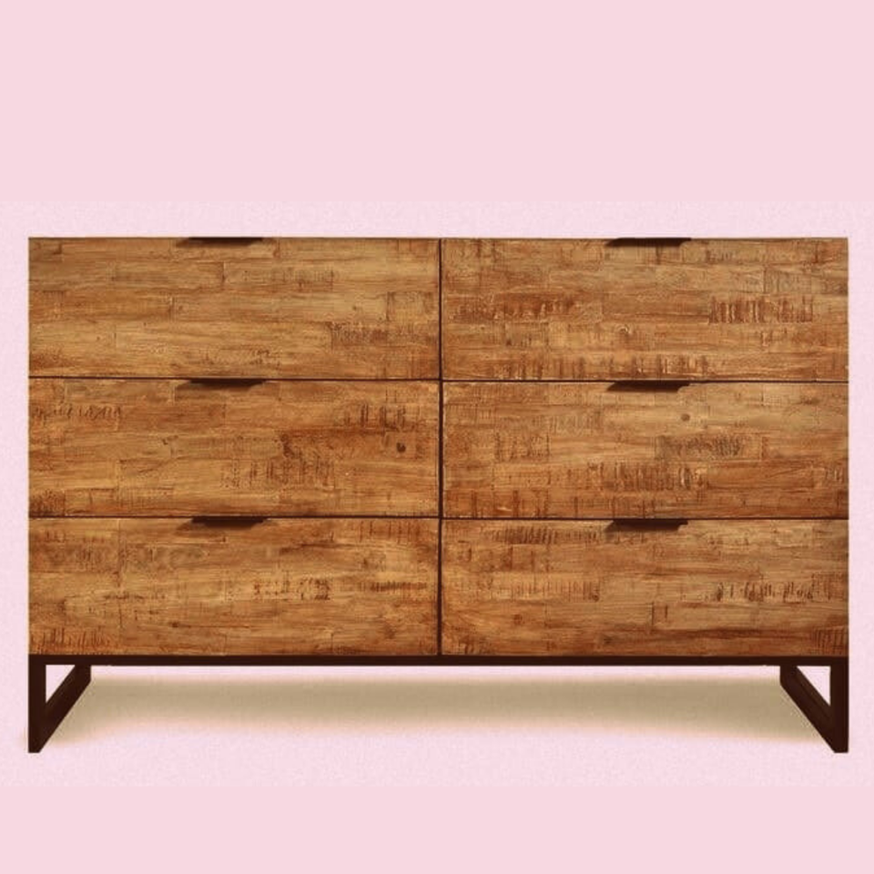 Distressed Finish Wide 6 Drawer Cabinet Storage Unit with Black Iron Legs Modern Home Furniture Dresser