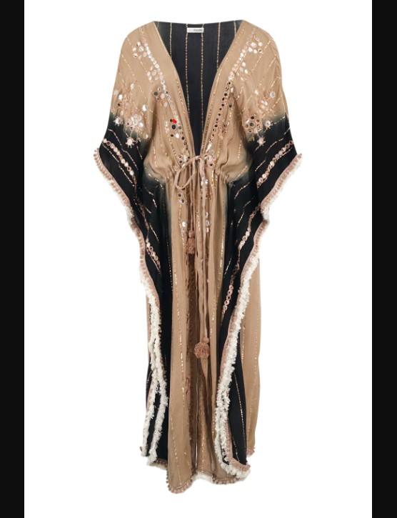 Dive Into Luxury Black & Sand Tie Dye Lurex Women Long Kimono Masterpiece Decorative With Mirror Embroidery Fringes Pom Pom Hem