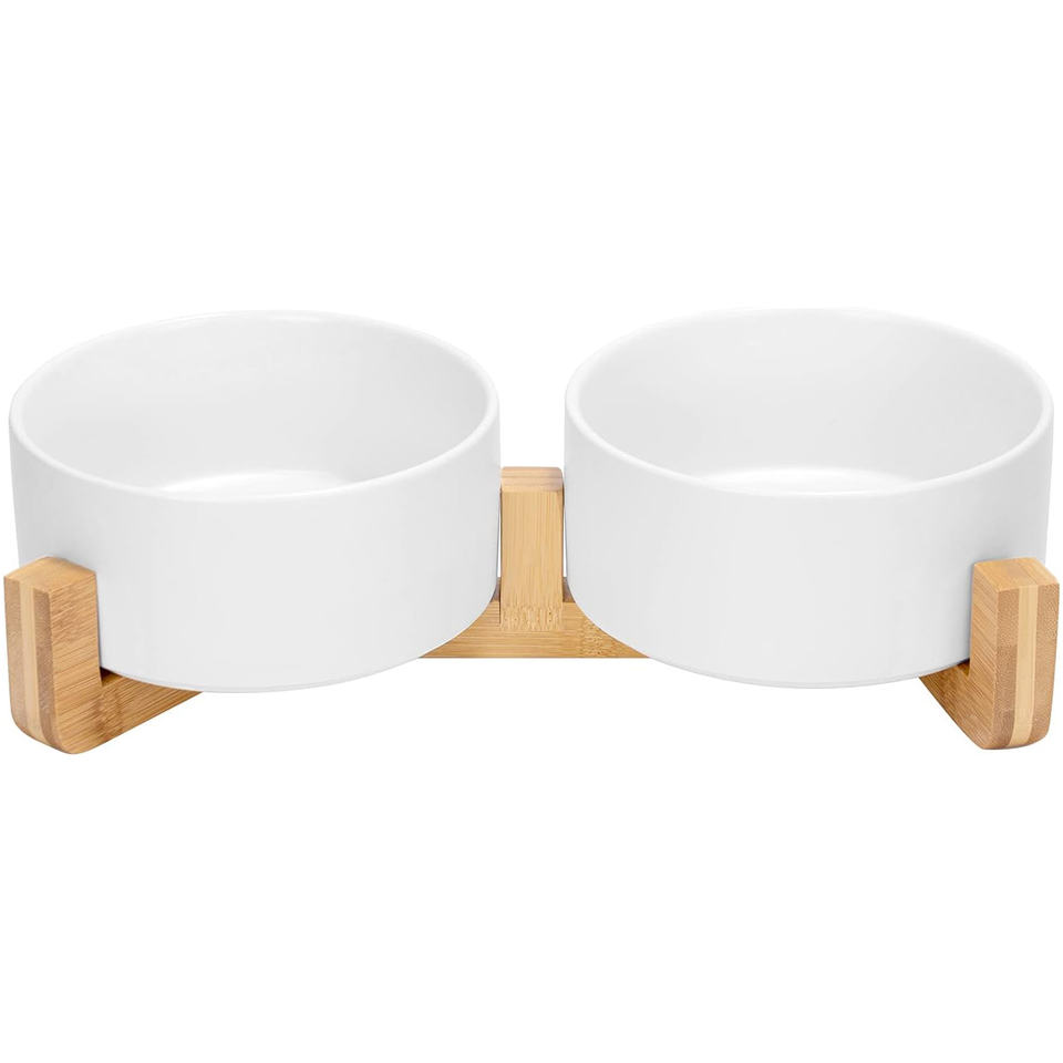 Doe Raised Dog Food Water Bowl Set Puppy Ceramic Pet Dog Bowl with Wood Stand Non-Slip White Pet Bowls Dog and Cat
