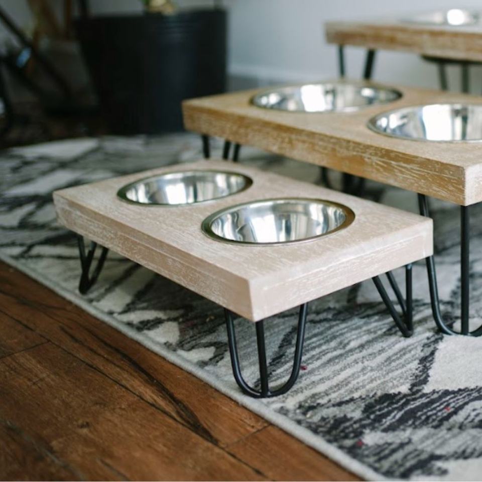 Dog & Cat Double Stainless Steel Bowl Feeder Wooden Top and Black Metal Frame Food and Water for Small Medium and Large Dogs