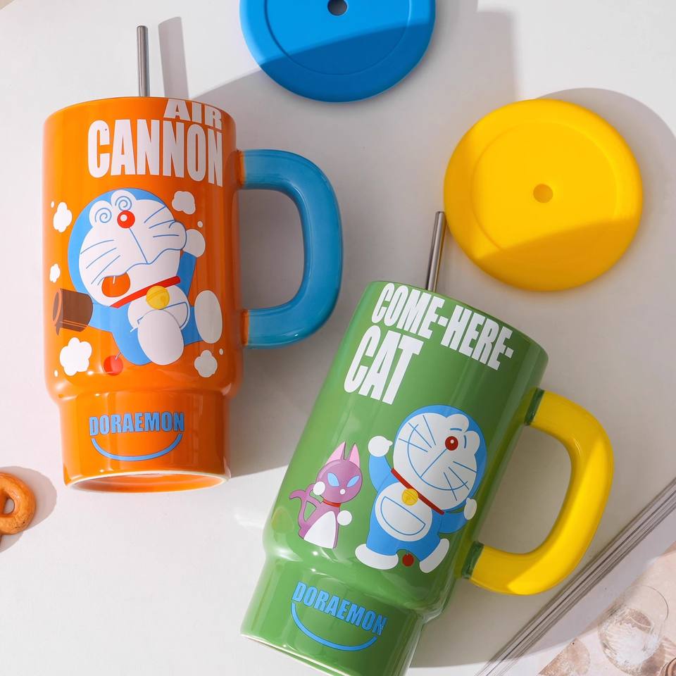 Doraemon Ceramic Ice Cup Extra Large Capacity With Straw Insulated For Women Gift Cartoon Design Pink Green Yellow