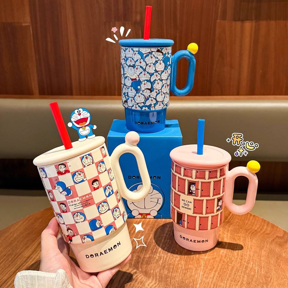 Doraemon Ceramic Straw Cup With Lid And Handle Large Capacity Hand Painted Underglaze Colors Gift For Couple Birthday