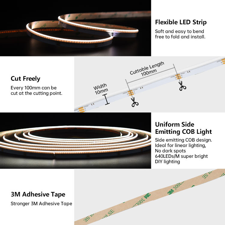 Dot-free Side Emitting COB LED Strip CRI 90 2700K to 6500K White 24V 10mm Wide 5m Reel Edge ledflexible led strips
