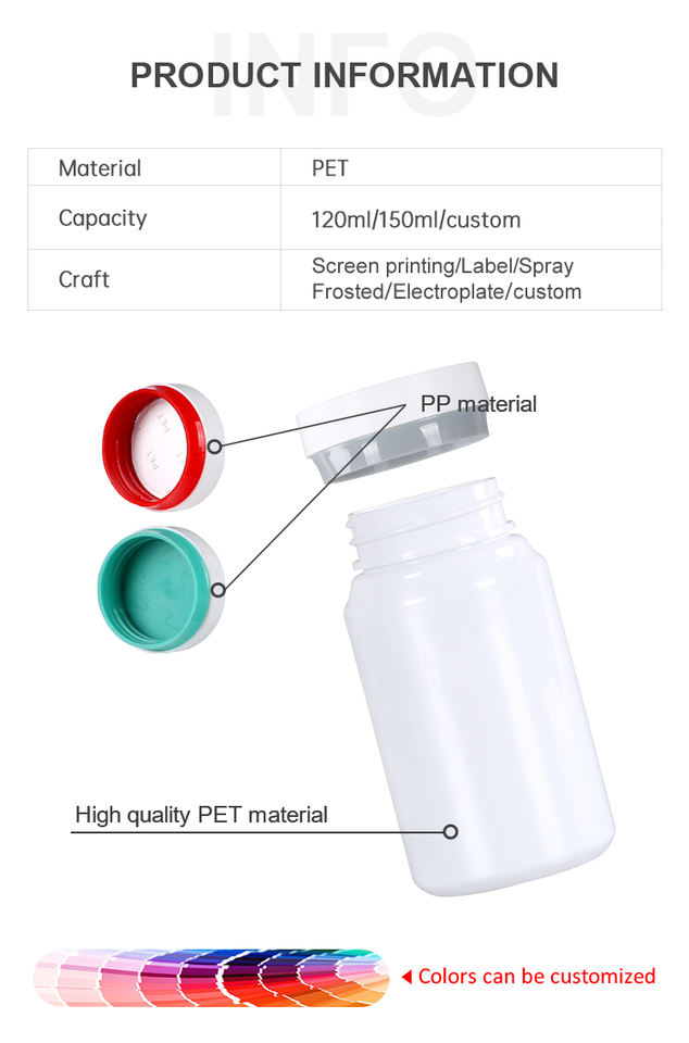 Double Colour Cap PET White Food Grade 120ml Support Customization for Supplement, Capsule, Tablet, Fish Oil Pharmacy Bottle