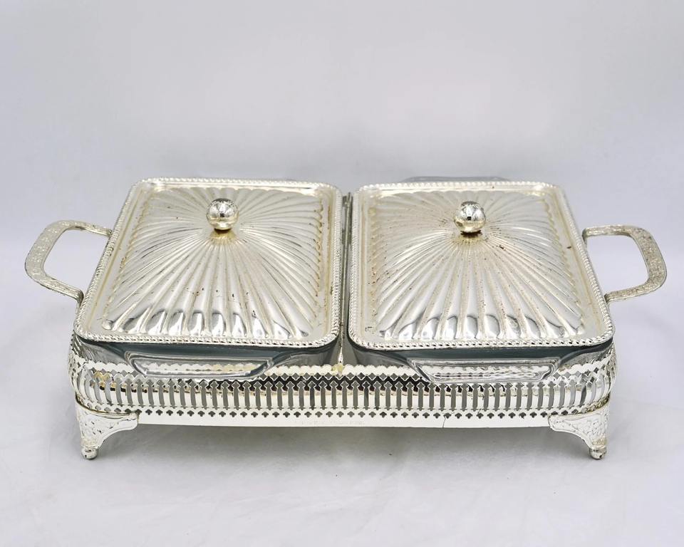 Double Compartment Silver Finish Casserole With Lids And Stand For Hot Food Serving And Festive Table Display From India