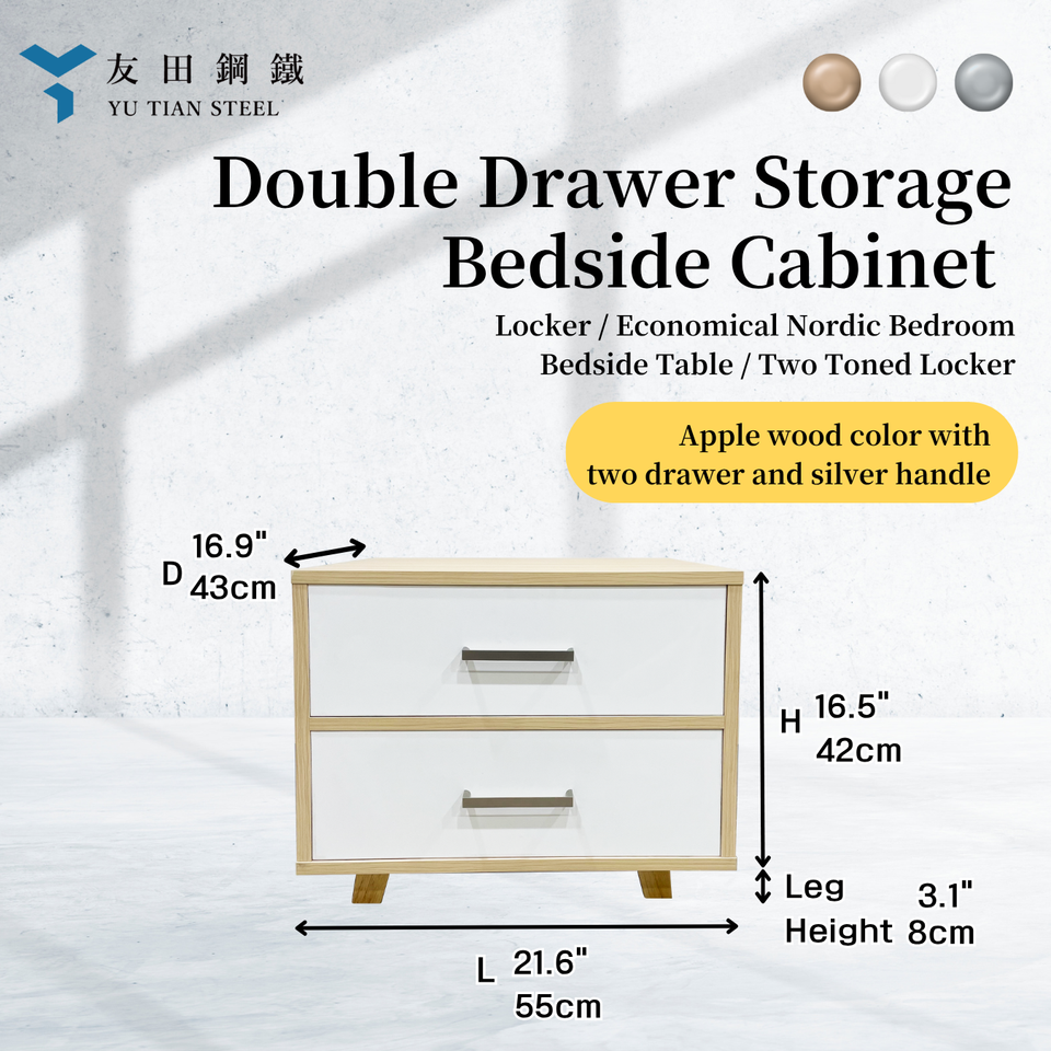 Double Drawer Bedside Cabinet - Two-Tone Nordic Style Locker Apple Wood Color with Silver Handles Bedroom Furniture
