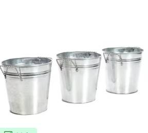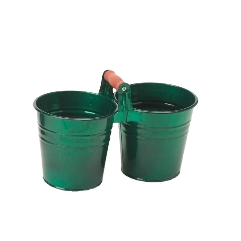Double Green Metal Bucket Planter with Wooden Handle Ideal for Herbs Storage Crafts or Rustic Garden Tabletop Decor Set