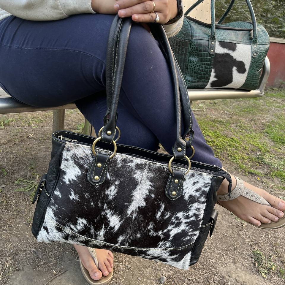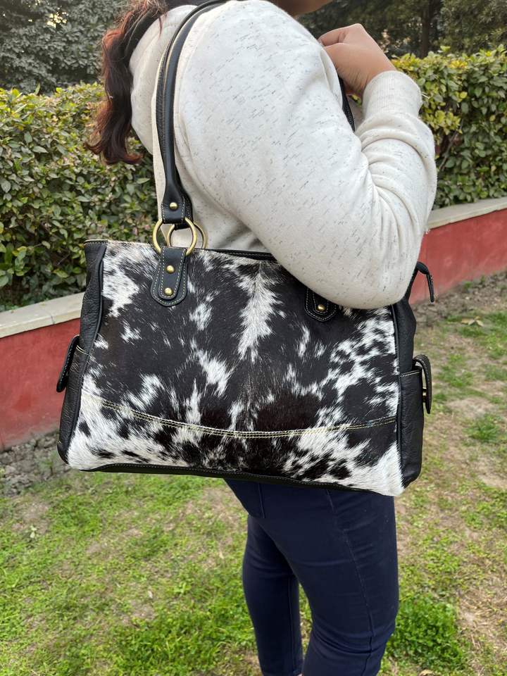 Double Soft Handle Shoulder Handbag Cowhide Hair On Western Women Tote Bag Real Cowhide Back Side Zipper Pocket Leather Bag