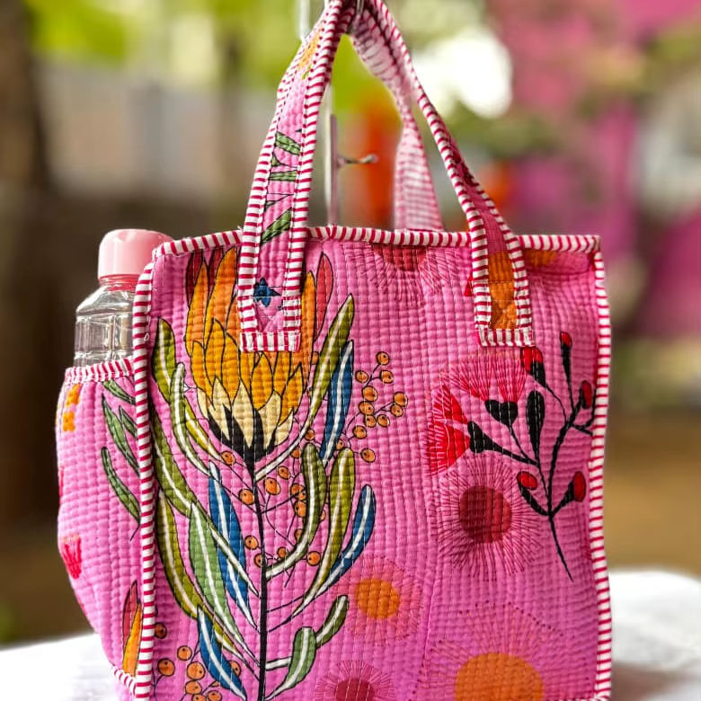 Double Handle and Zipper Pocket Closure for Winter Shopping High Quality Cotton Indian Quilted Tote Bag Small Handbag with