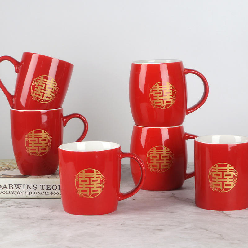 Double Happiness Ceramic Mug Wedding Gift Set For Lovers Traditional Chinese Design Red With Gold Pattern